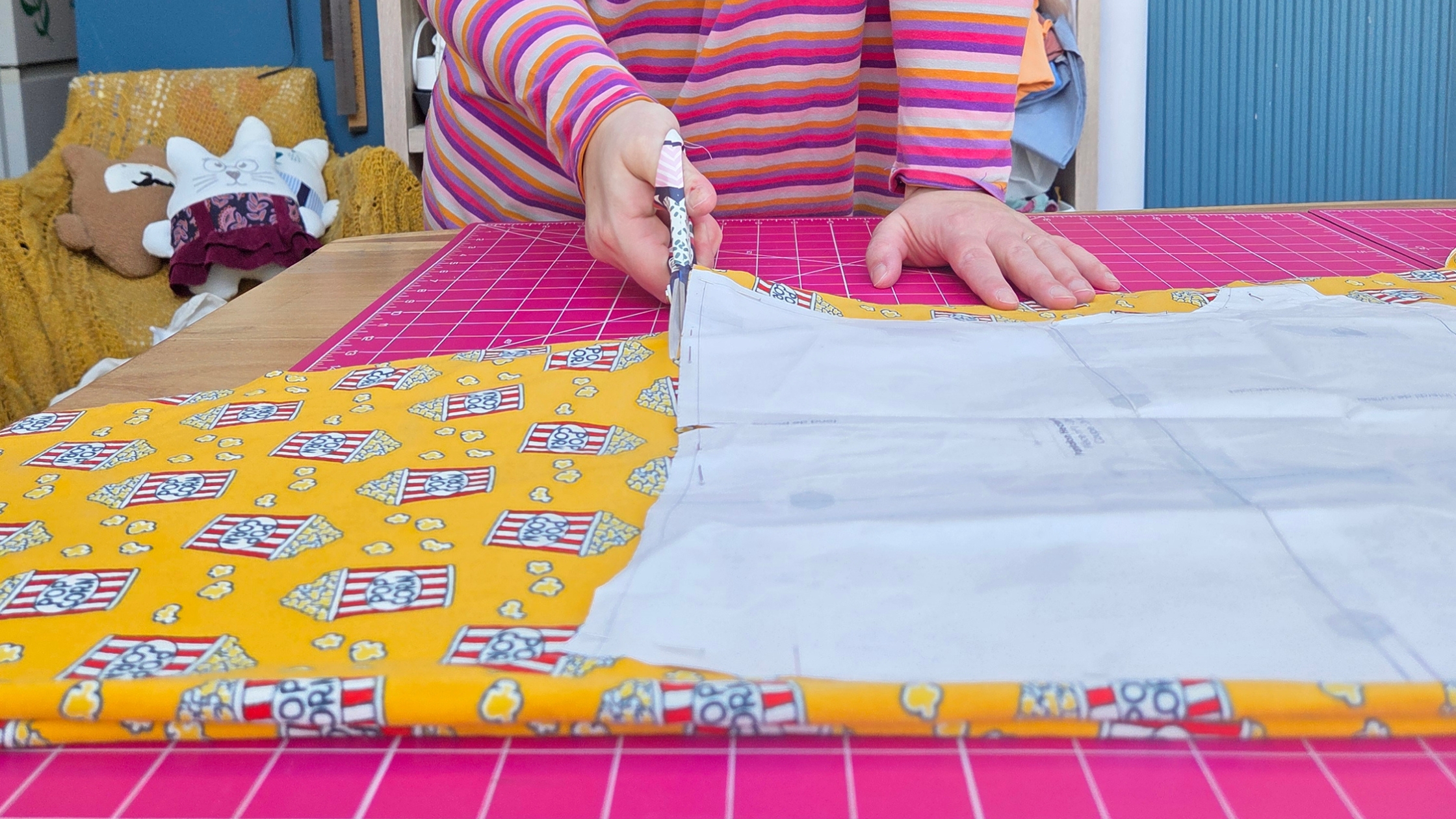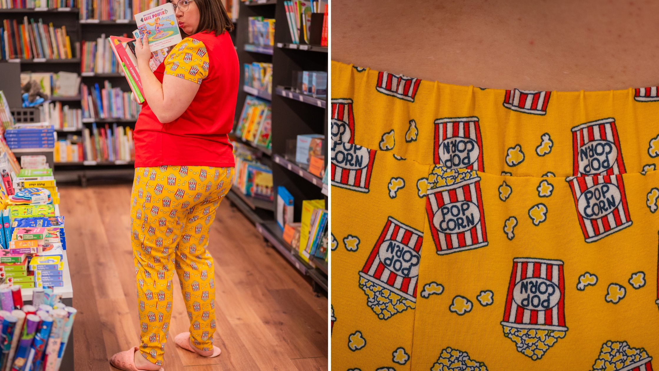 De mon côté, j’ai opté pour un jersey motif pop-corn offert par une abonnée il y a quelques années (merci Linda) et comme je n’avais pas assez pour l’ensemble, j’ai trouvé un jersey rouge. Ils sont de la même composition : jersey coton & élasthanne. C’est donc idéal pour mixer les deux.