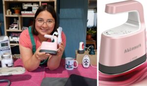 Photo de la presse à chaud mini Ablemark utilisée pour le transfert de flex thermocollant sur tissu – test et avis matériel couture.